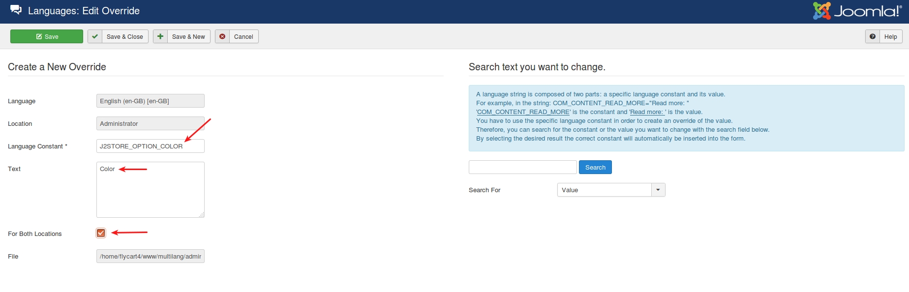 2. Enter the language string (which is given as a option name) and give its value in the Text box. Choose For Both locations and save.