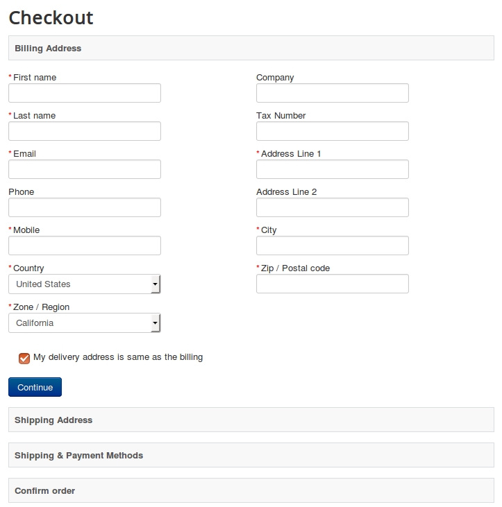 The checkout steps in J2Store use AJAX extensively in order to provide customers with a better online shopping experience. Customers do not have to wait for the checkout pages to refresh. The entire checkout is handled within a SINGLE PAGE and the checkout steps are loaded in an accordion style.