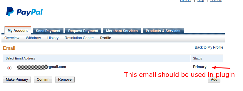Paypal allows you to add multiple emails in an account to accept payments. With the Paypal plugin for J2Store, make sure you are using your primary Paypal account email. You can check which is your primary email by signing into your Paypal account and then going to Profile -> Add / Edit emails page.